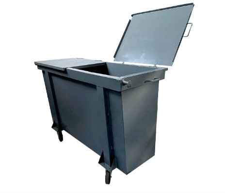 Com capacidade para cargas de até 700kg o Container de Lixo 1200 L Metálico possui chapa de aço laminado fina a quente 14 (1,9 mm), reforço do pino da pega em chapa estrutural SAE 1020 de ¼” (6,35 mm), reforço dos rodízios em chapa estrutural SAE 1020 de 3/16” (4,35 mm), pino da pega em aço SAE 1020 Ø 1 ¼” (31,75 mm) e pintura em fundo óxido e acabamento em base sintética.